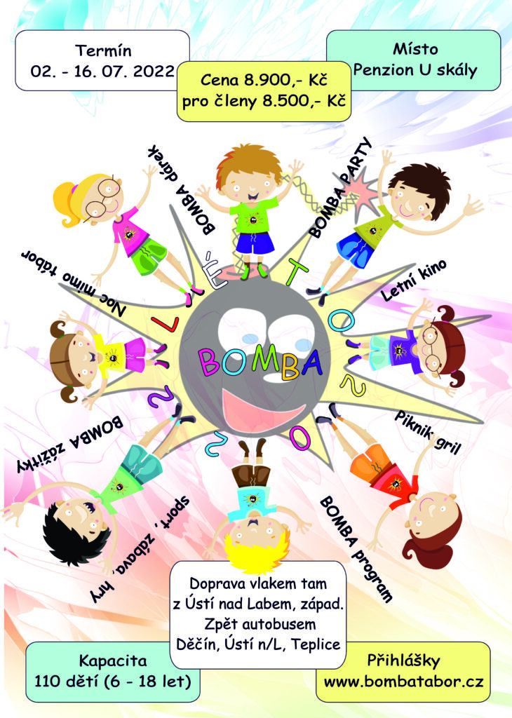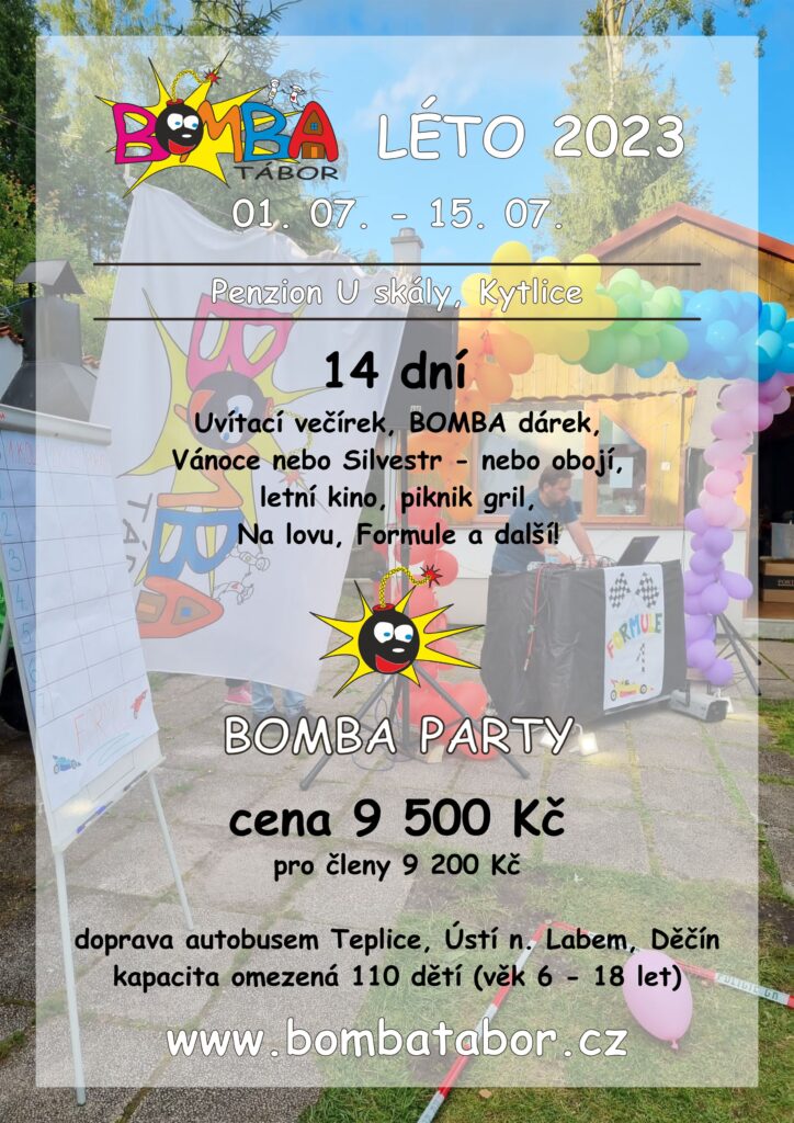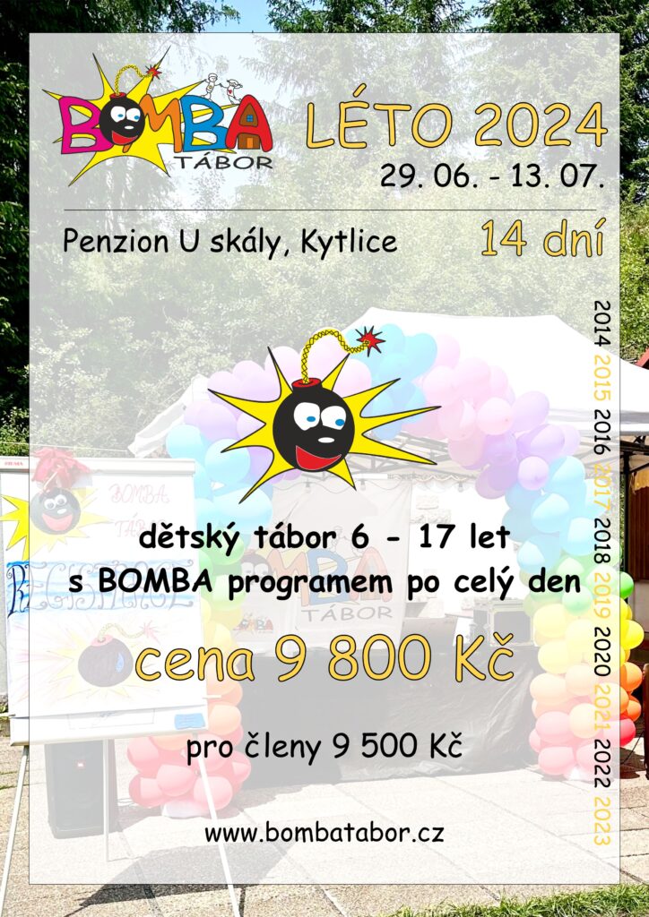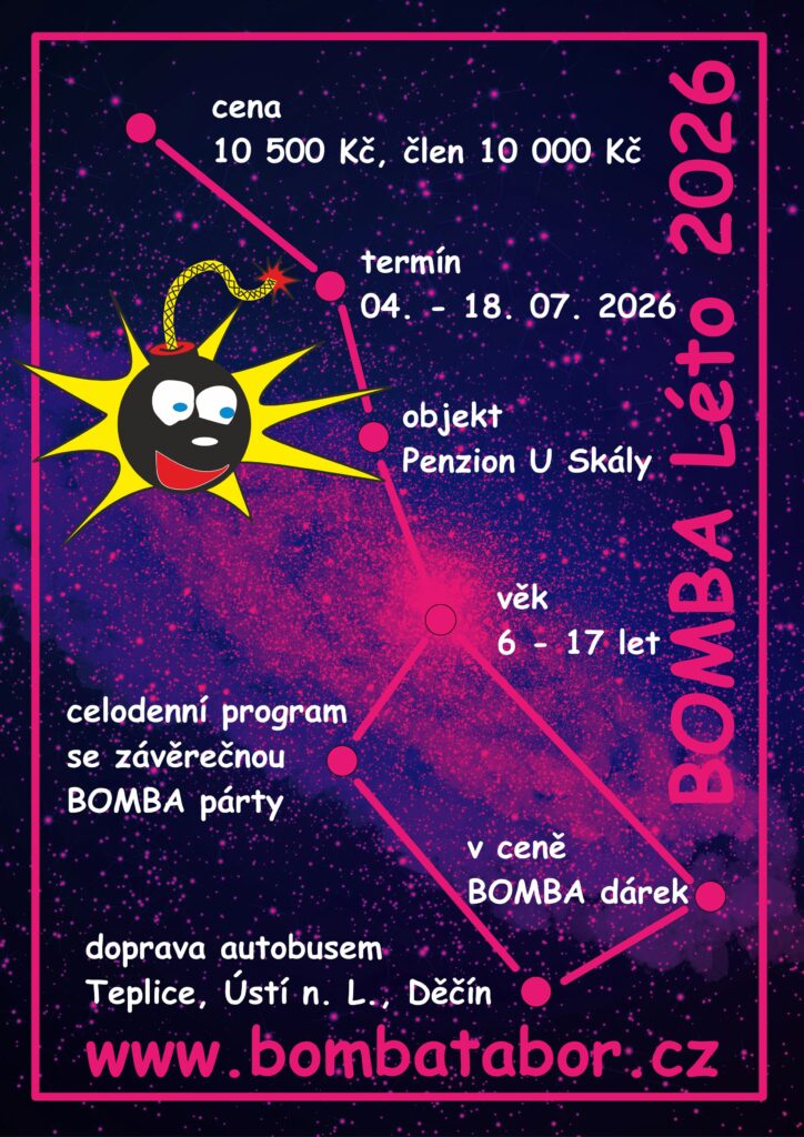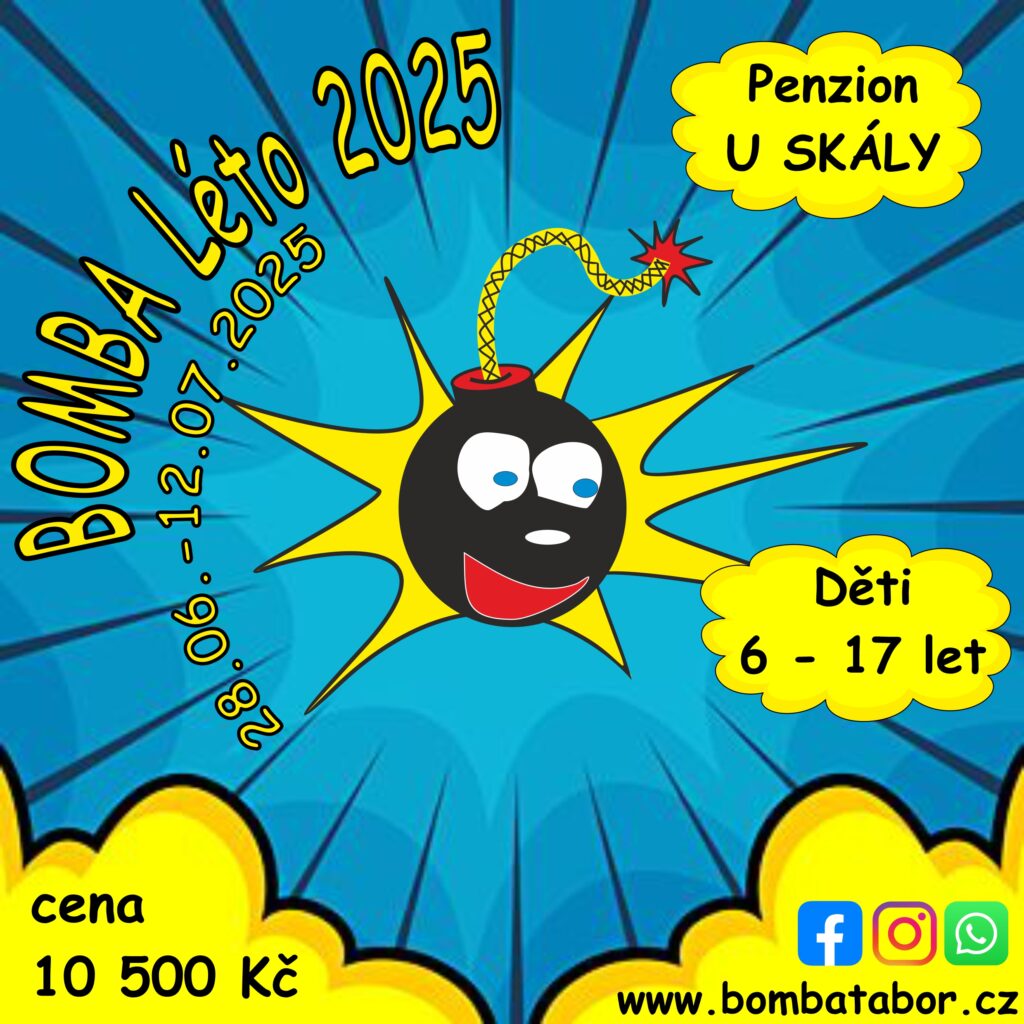 BOMBA tábor organizuje pouze jeden termín letního dětského tábora „BOMBA Léto 2026“ v termínu 04. 07. – 18. 07. 2026 v *Penzionu U Skály* – 14 dní. Uzávěrka přihlášek je po naplnění kapacity. Přihlášení se provádí v elektronickém formuláři pod odkazem na našich webových stránkách.