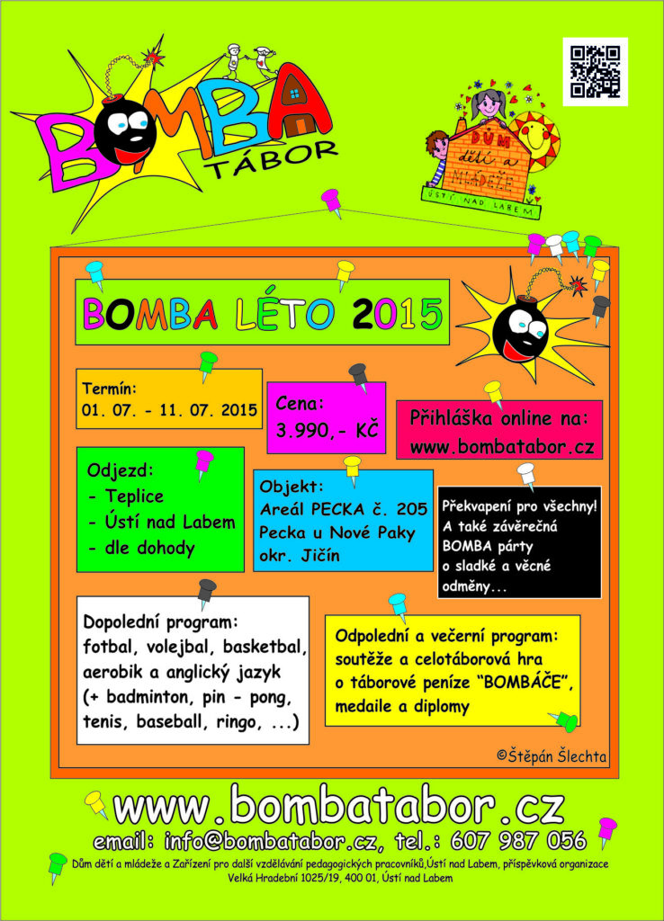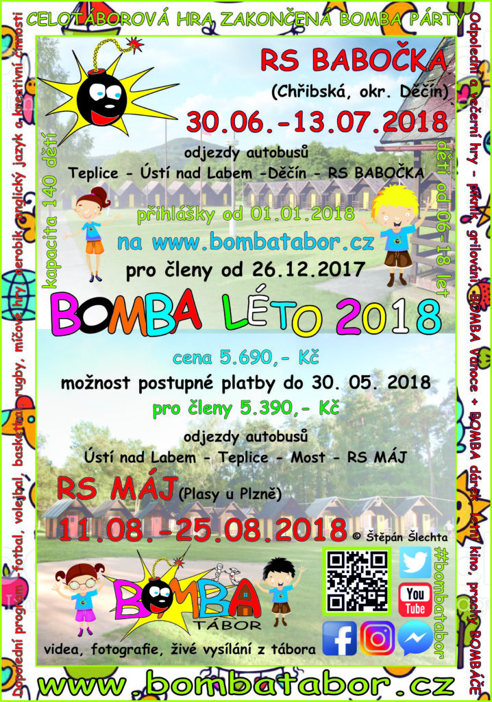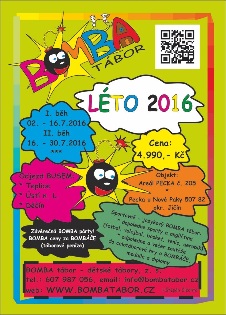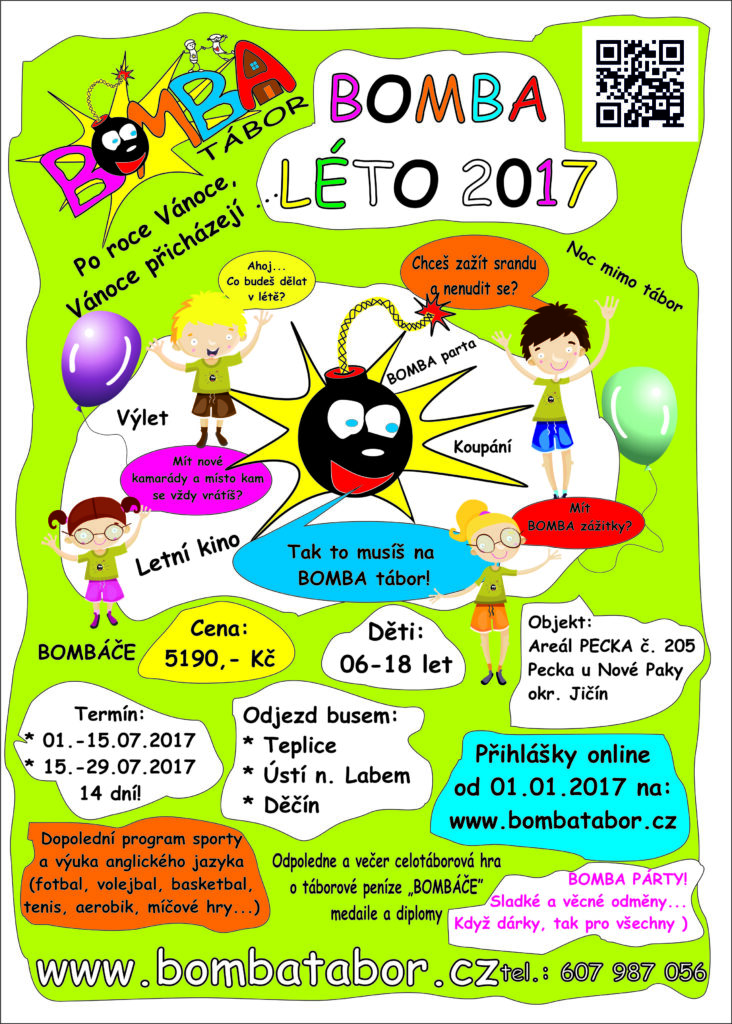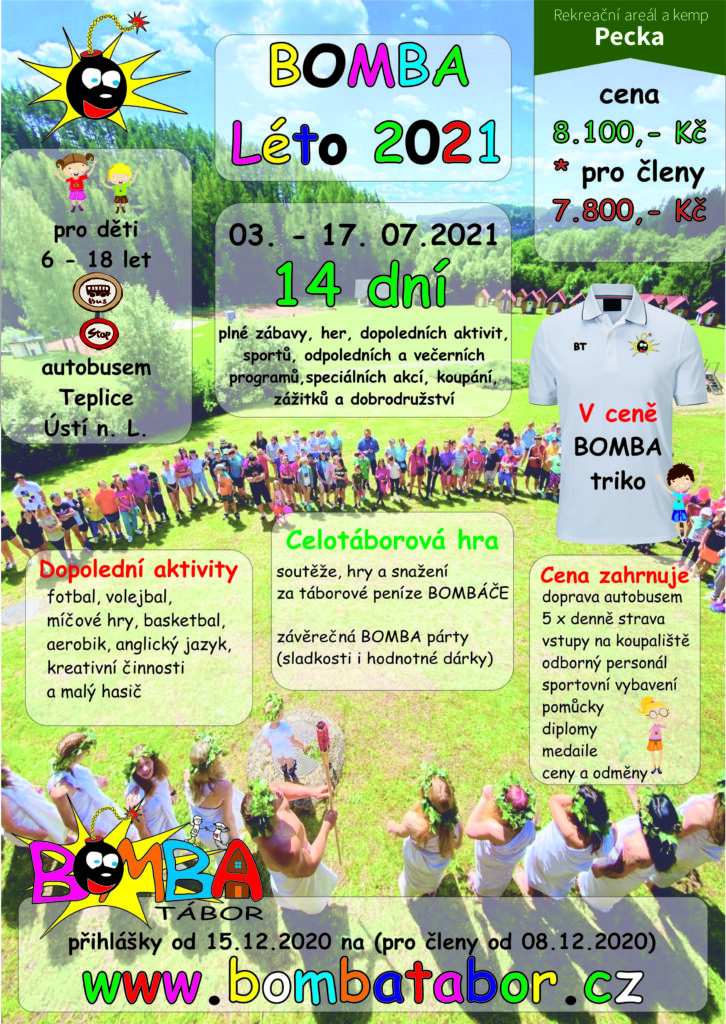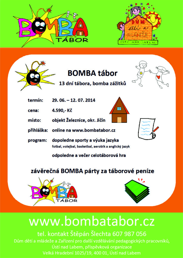 BOMBA tábor organizuje pouze jeden termín letního dětského tábora „BOMBA Léto 2026“ v termínu 04. 07. – 18. 07. 2026 v *Penzionu U Skály* – 14 dní. Uzávěrka přihlášek je po naplnění kapacity. Přihlášení se provádí v elektronickém formuláři pod odkazem na našich webových stránkách.
