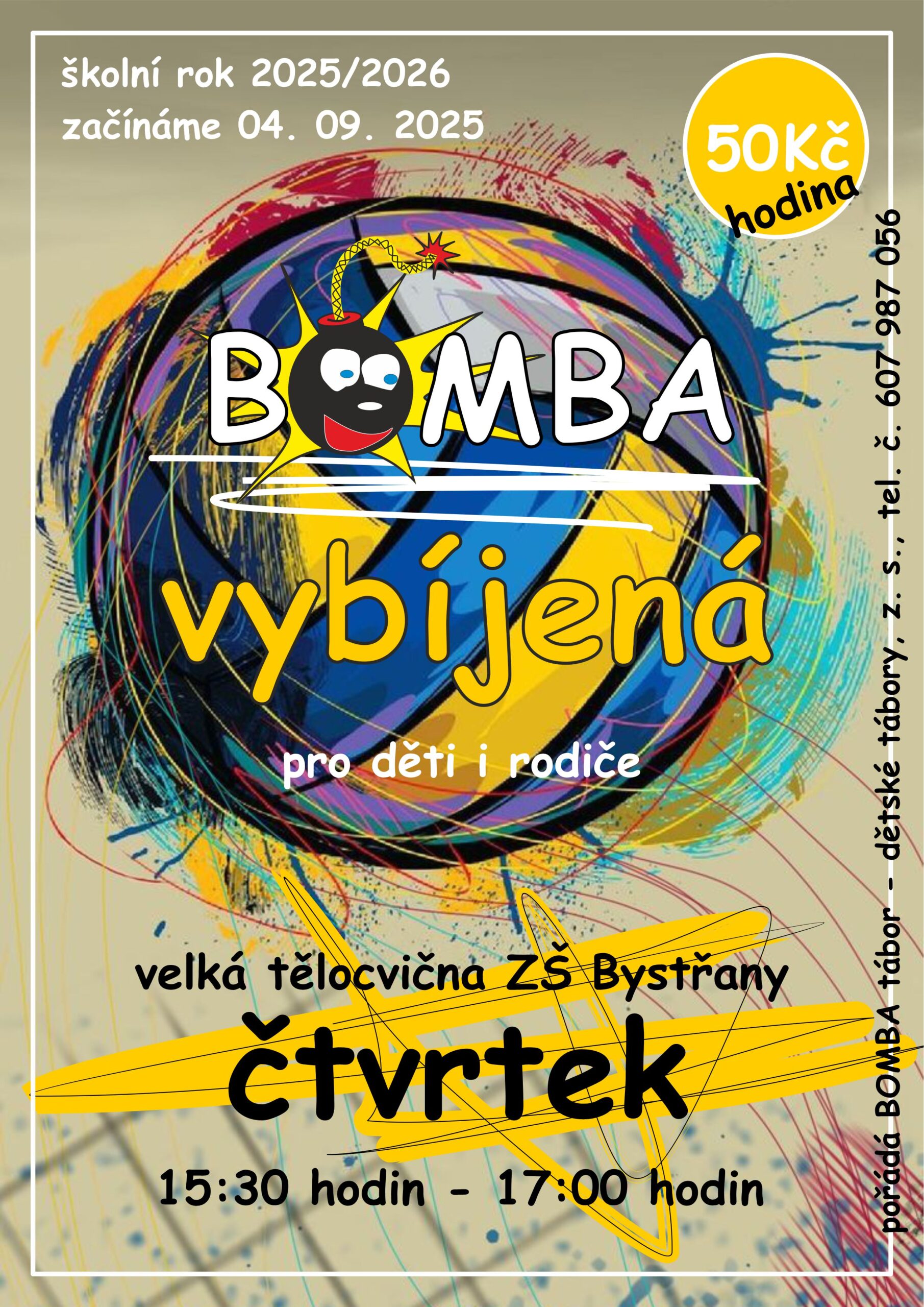 Každý čtvrtek (mimo školních prázdnin) se koná od 15:30 hodin do 17:00 hodin ve velké tělocvičně ZŠ Bystřany „BOMBA vybíjená“ – po letních prázdninách začínáme ve čtvrtek 04. 09. 2025.